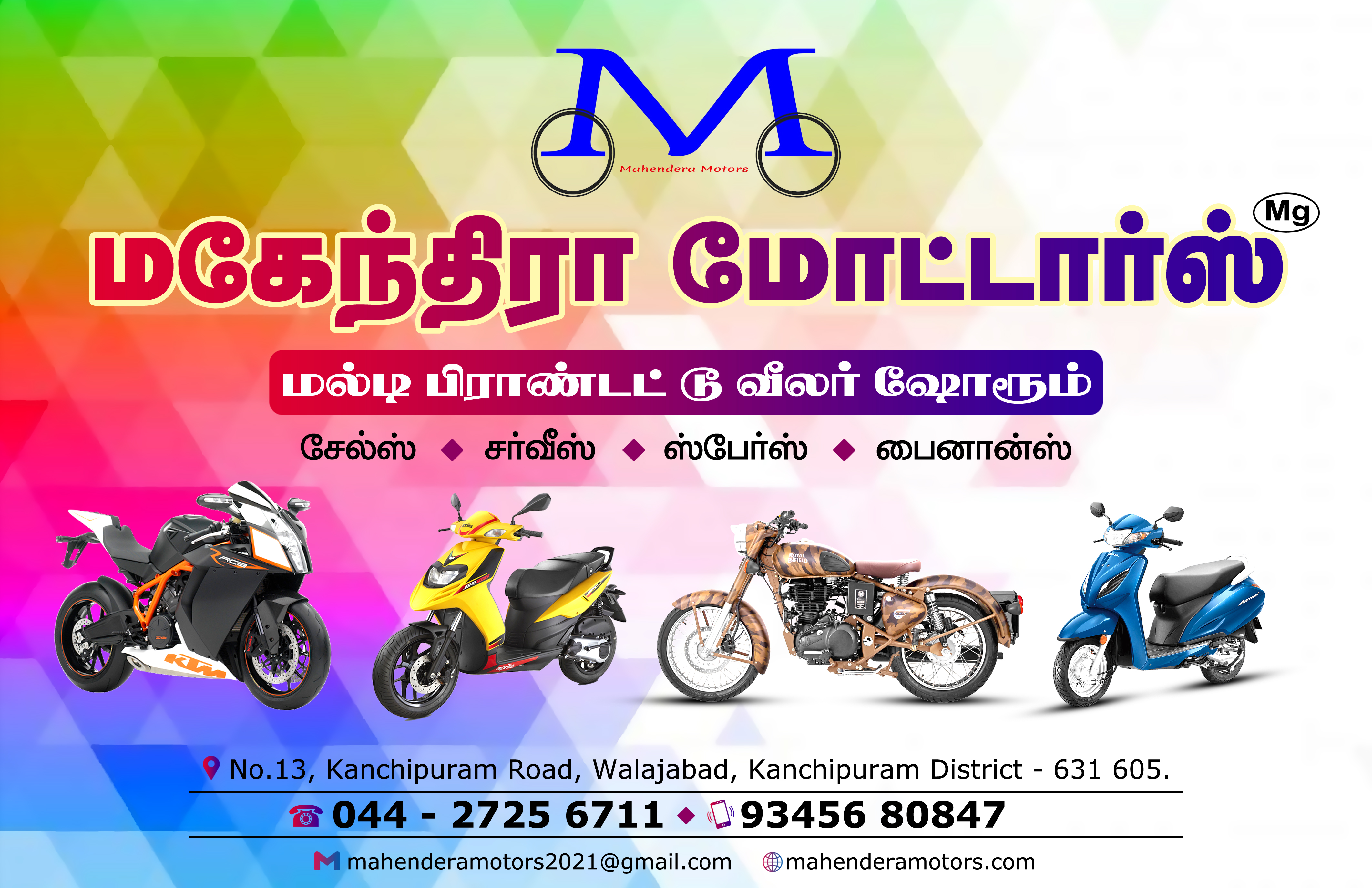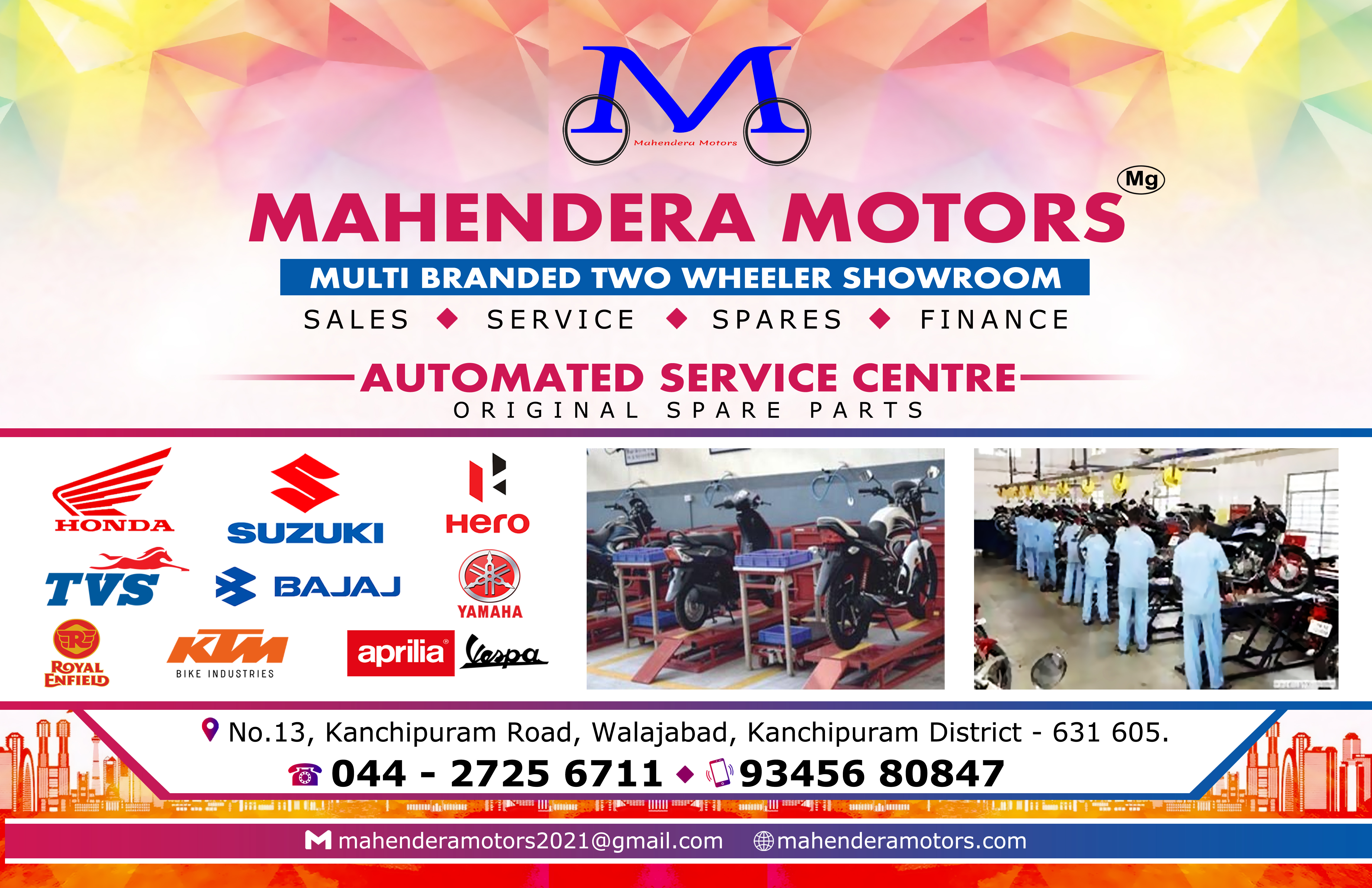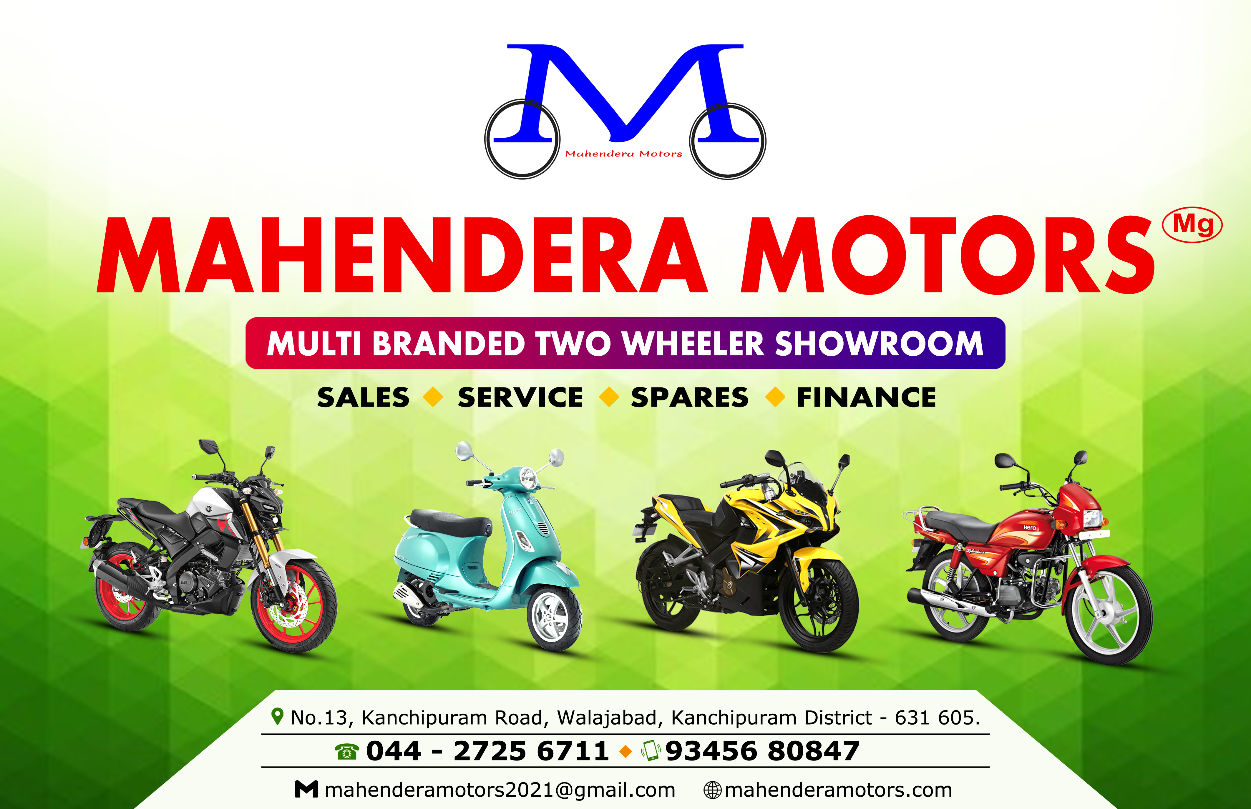 20 years of experience. Largest Multi Brand Two Wheeler Showroom in Kancheepuram. We are happy to announce that your mahendera motors, is now selling two wheelers of all brands.