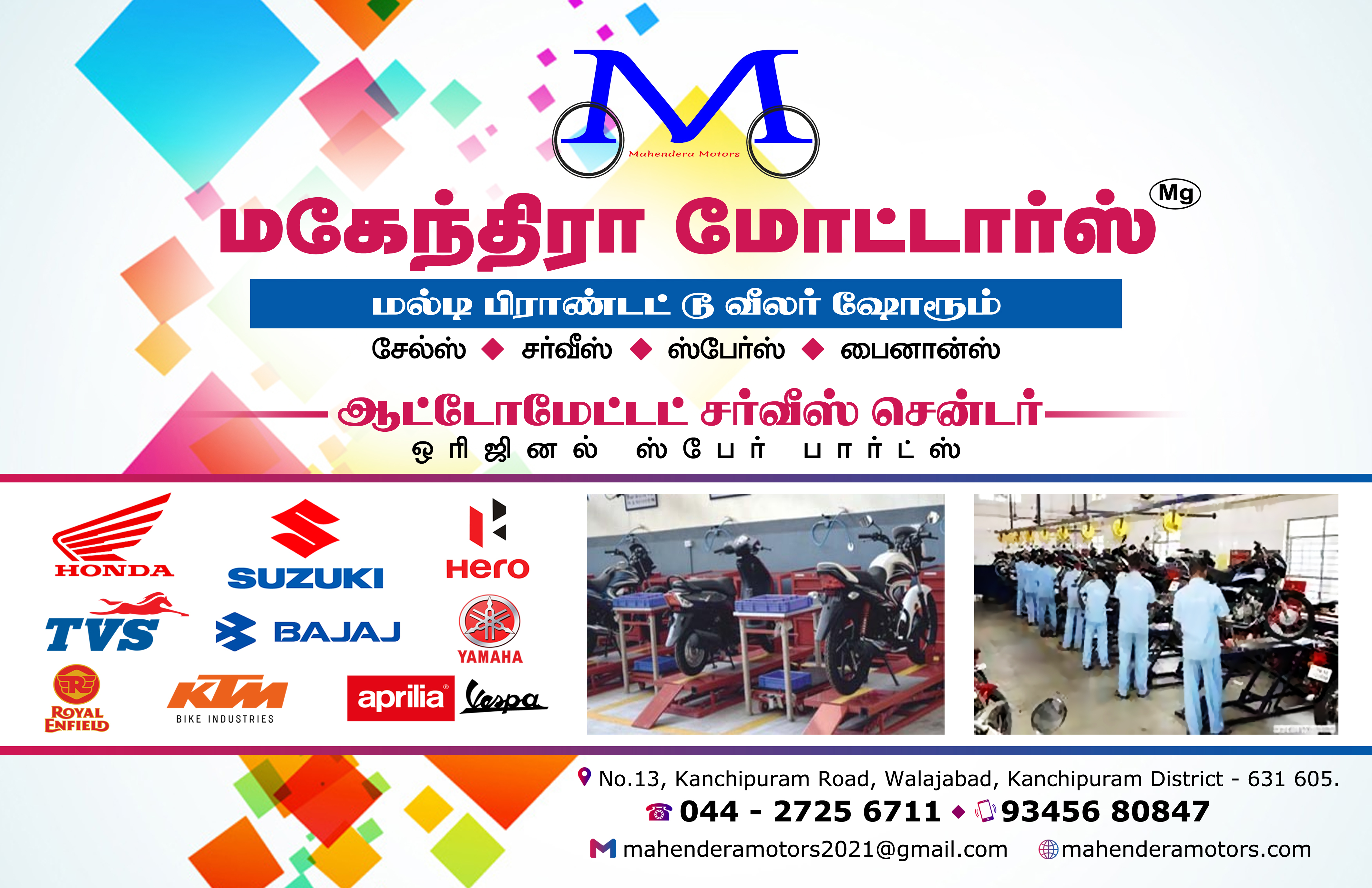 காஞ்சிபுரம் மாவட்டத்திலே மிக பெரிய மல்டி பிராண்ட் டூவீலர் ஷோரூம். உங்கள் மகேந்திரா மோட்டார்ஸ் என்பதை மகிழச்சியாக தெரிவித்து கொள்கிறோம்.