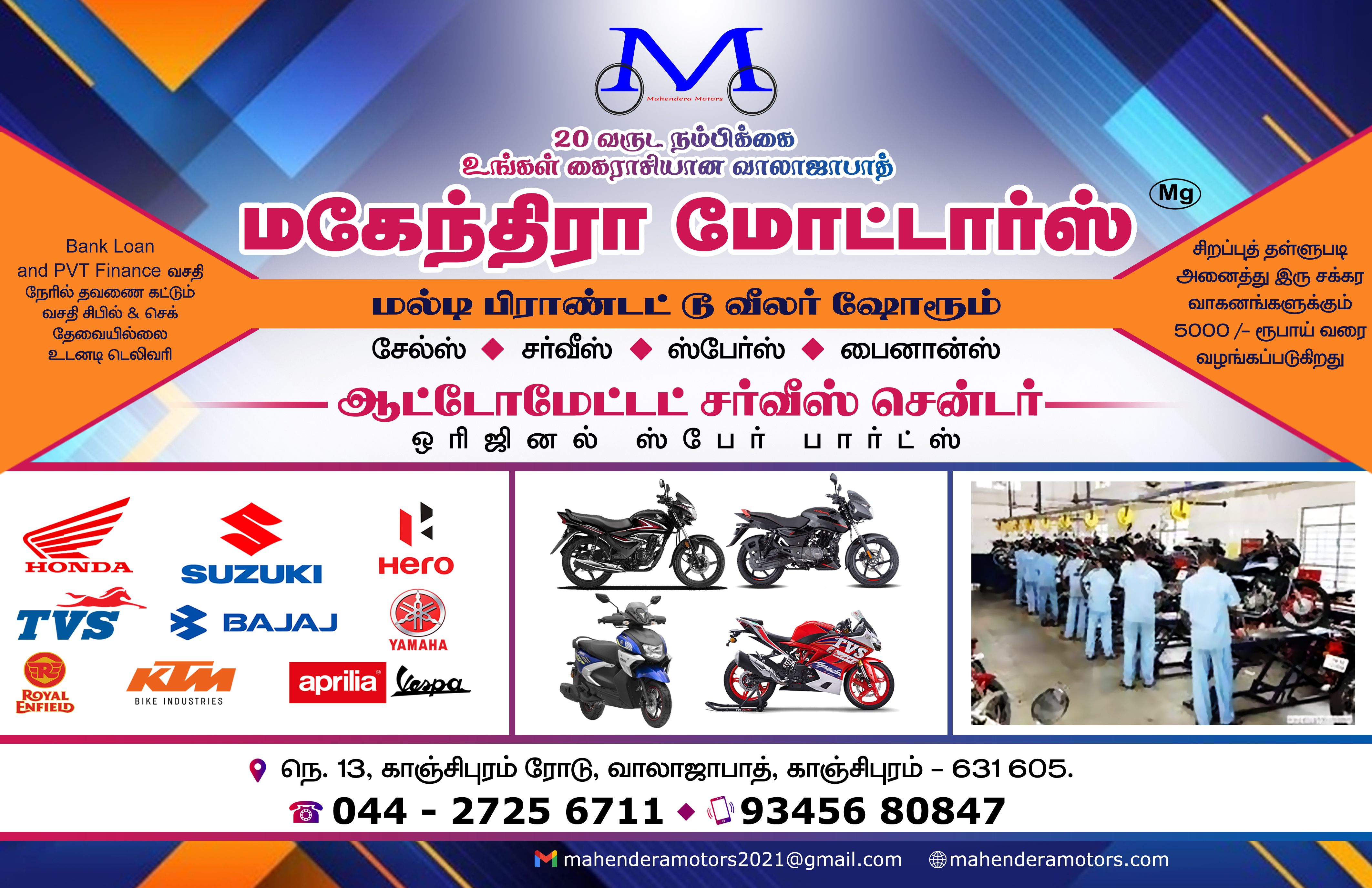 20 years of experience. Largest Multi Brand Two Wheeler Showroom in Kancheepuram. We are happy to announce that your mahendera motors, is now selling two wheelers of all brands.